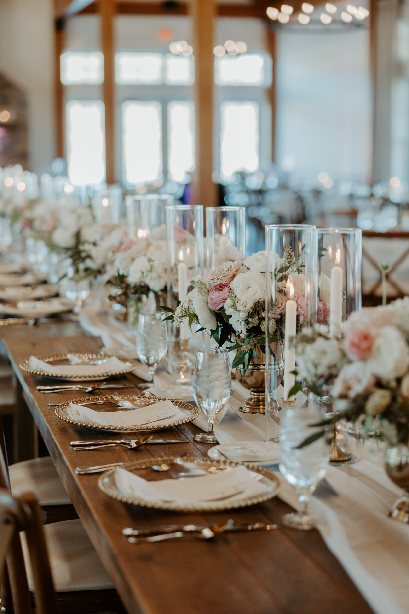 Romantic, blush, spring wedding at the Lakehouse at Owl’s Nest Resort. The venue consists of rustic farm tables, beautiful wooden beams, a stone fireplace and cross back wooden chairs, for a rustic yet modern style. We combined soft florals and gold accents to warm up this space and create a romantic and natural look. Gold taper candles, gold compotes, white pillar candles, gold charger plates and chiffon table runners added to the table designs. Florals included soft blush roses, fragrant tuberose, white stock, seeded eucalyptus, double flowering tulips, white ranunculus and other spring florals. Photographer: Ashley Olafsson Photography || Venue: The Lakehouse at Owl’s Nest Resort