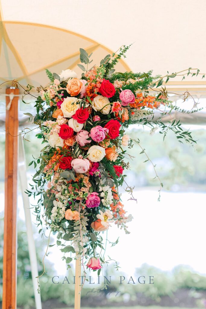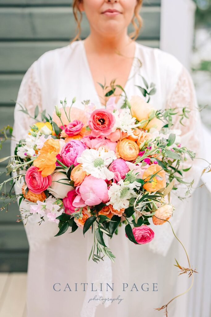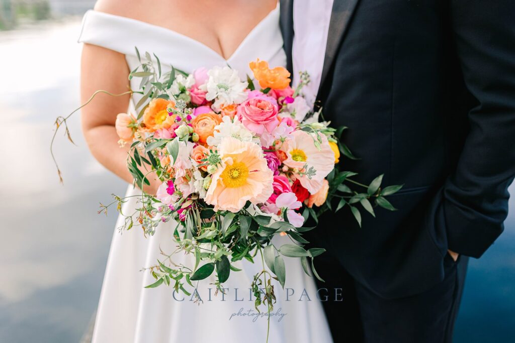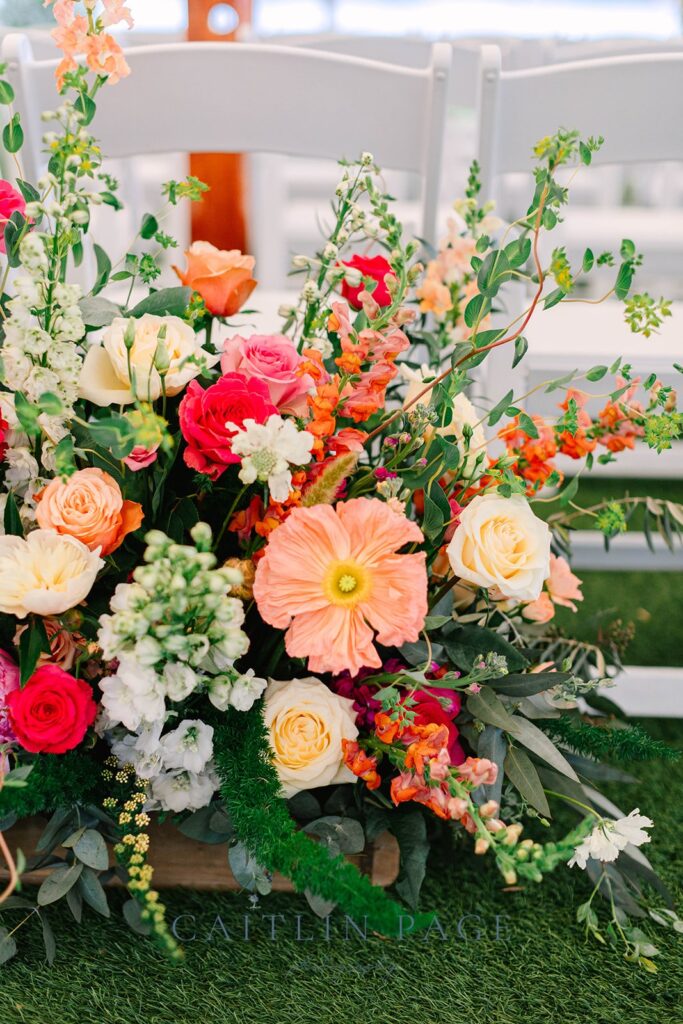 These gorgeous spring blooms really made this wedding stand out. Not only were the colors stunning, but the blossoms were amazing; twisting poppies in orange, peach and pink, vibrant ranunculus, dancing sweet peas, scabiosa, and trailing jasmine vine.