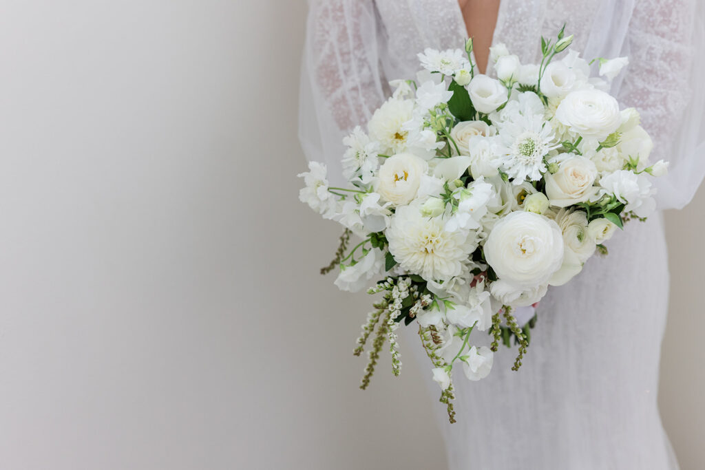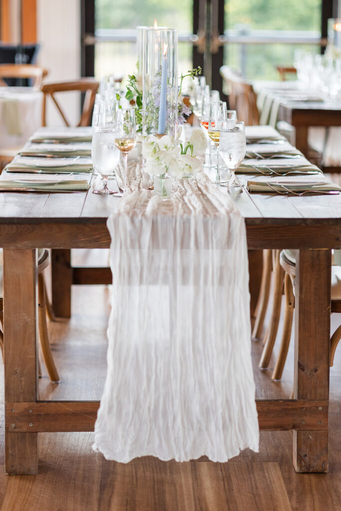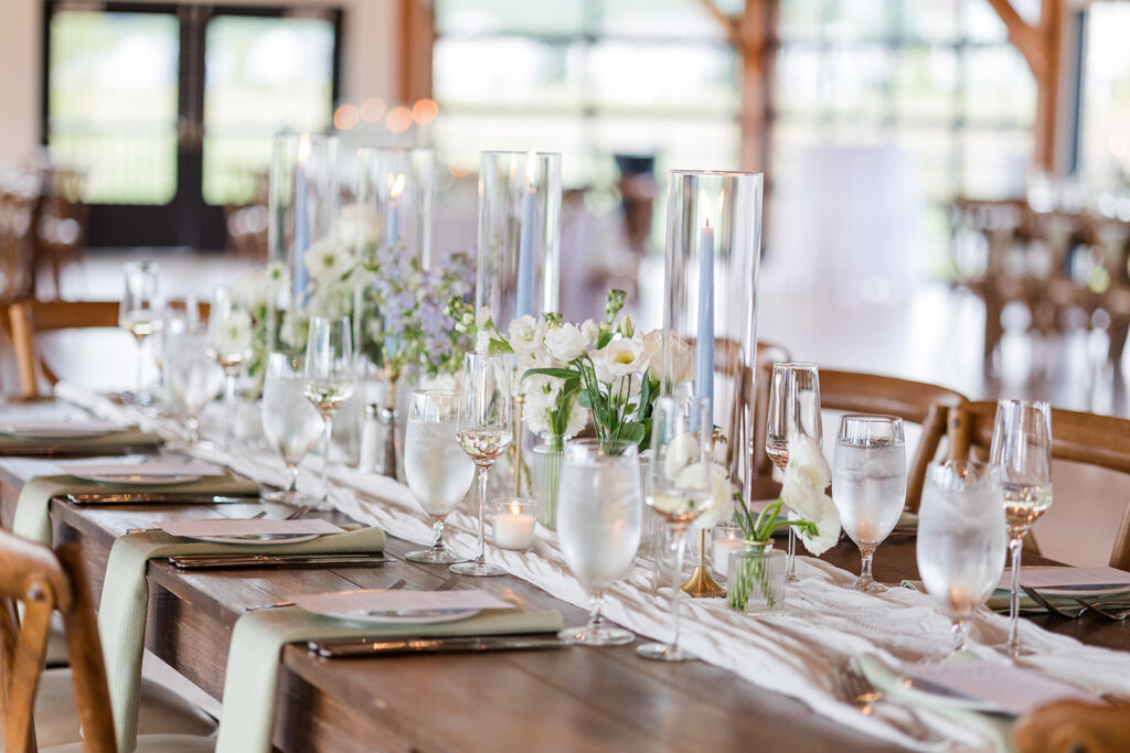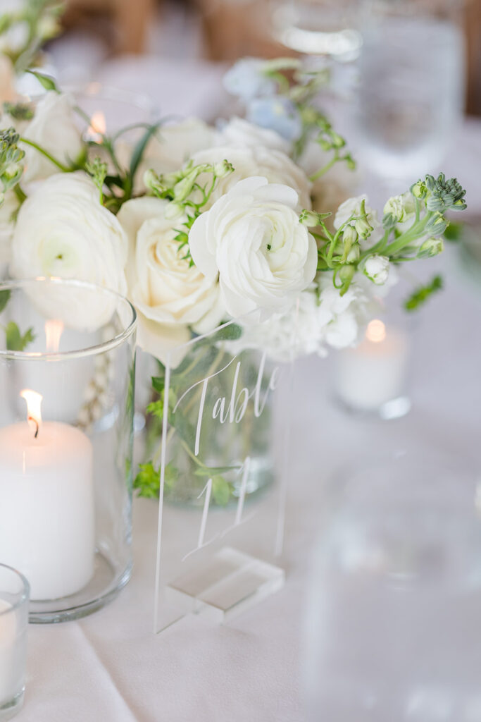 Lorin and Shaun were married on a beautiful September day at Owl’s Nest Resort in Thornton, NH. The bride chose crisp white blooms with accents of pale blues and soft green napkins. Accents of pale blue delphinium added a hint of blue to the designs along with pale blue taper candles in gold holders. A classic, yet elegant style.
